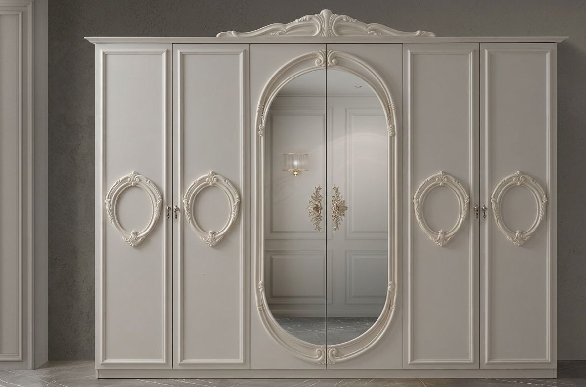 Setul este compus dintr-un dulap spațios cu 4 sau 6 uși, oferind soluții generoase de depozitare, un pat confortabil cu dimensiuni ample pentru un somn odihnitor, o comodă elegantă perfectă pentru organizarea obiectelor personale, două noptiere practice și un taburet rafinat, completând funcționalitatea ansamblului. De asemenea, oglinda decorativă adaugă un plus de stil și luminozitate încăperii.